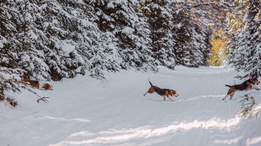 I tried my best to shake off the shivers as I zipped up my coat and shoved my cold hands deep into my pockets where the “Hot Hands” had been given only a mere minute to warm up. The sky was clear and the air was still as the sun began peeking its way through the snow-covered conifers that carpeted the mountainside. It was a balmy early February morning, with the mercury hovering just above the freezing point. Although there was about a solid foot of snowpack on the ground, a fresh dusting fell overnight, lending to prime scenting conditions for our hunt. As Tom and Matt collared the dogs, their excited whimpers signaled they were ready to get to work as a shared anticipation grew between both hunters and hounds. As the tailgate dropped and the dogs took chase into the timber, I let out a cathartic sigh of contentment, for chasing beagles and bunnies during the winter months in the North Country is about as good as it gets.